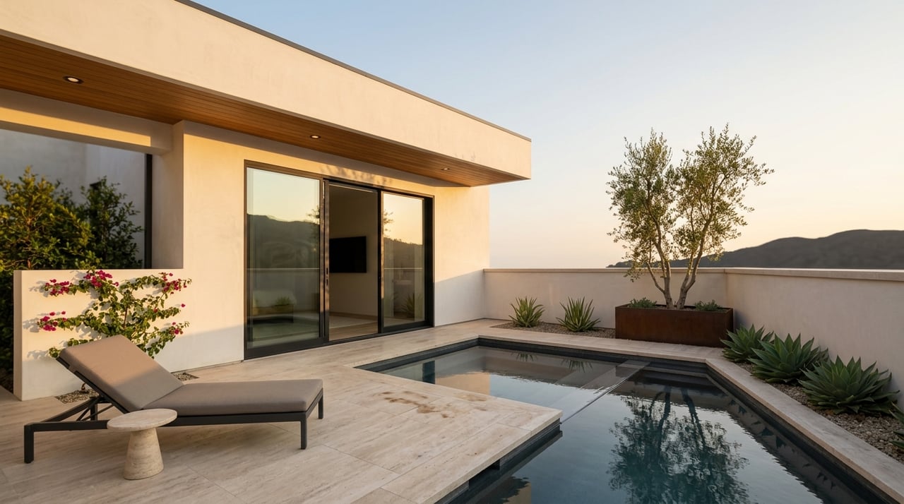 Lots are often larger but irregular and sloped. Usable outdoor space is created with terraces, cantilevers, rooftop decks, and view-facing pools. Large contiguous lawns are possible, but they often require earthwork and retaining walls.
